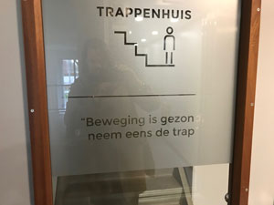 ‘Lucht, water, voeding, licht, bewegen, comfort, mind’ staat er op de plaquette in de hal van complex Rijndijk waar Annelies woont. Bij het trappenhuis staat in het glas gegraveerd dat bewegen gezond is: ‘Neem eens de trap’, om bewoners aan te sporen om meer te bewegen. “Het draait hier om woongenot en gezondheid.” Volgens Annelies beschikken alle appartementen over balansventilatiesystemen met warmteterugwinning en zijn deze systemen voorzien van speciale luchtfilters die fijnstof uit de lucht filteren. Ook zijn er beneden in het gebouw filters geplaatst die medicijnresten uit het water halen. “En zonnepanelen zorgen voor de energievoorziening voor de algemene ruimtes.”