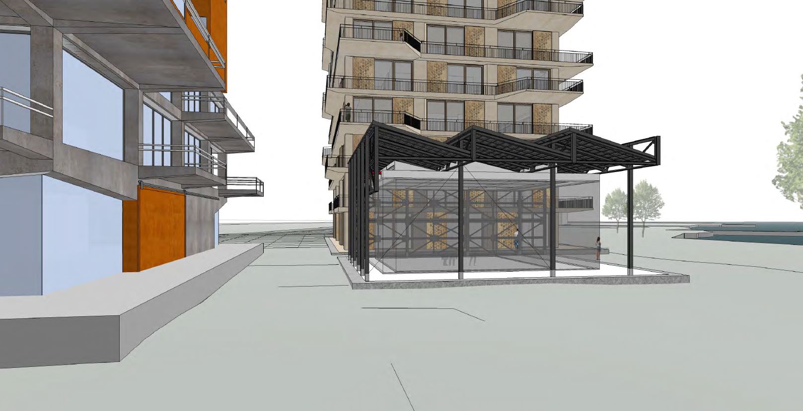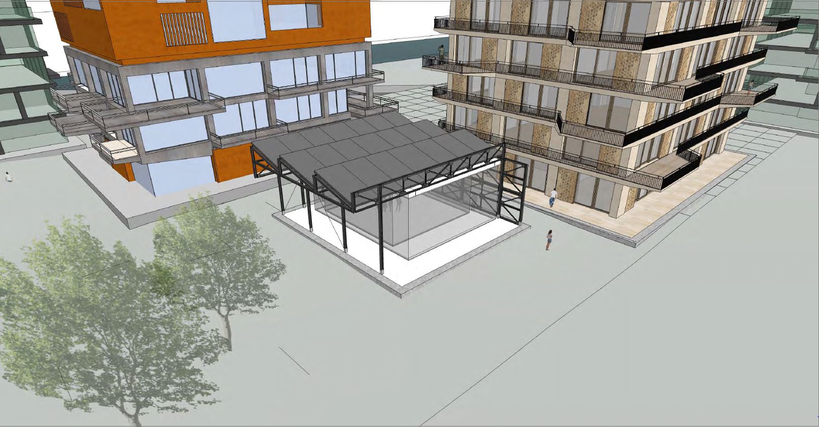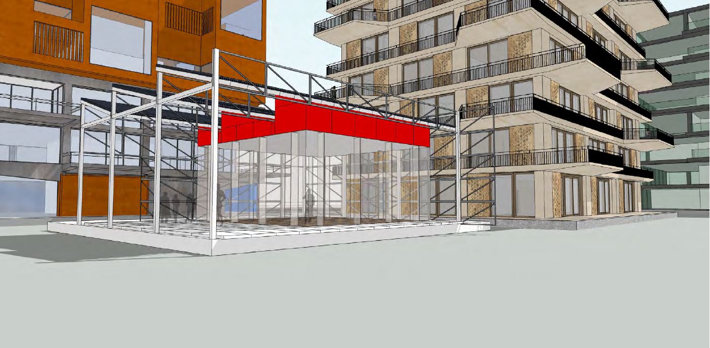 Op de kop van het terrein, vlakbij het water, komt het paviljoen te staan waarvan het skelet afkomstig is van de Cruquiusweg (eveneens) in Amsterdam. Zodra het op de locatie Noorderkaap staat, gaat het dienst doen als een bouwbord met mogelijkheden voor projectieschermen. “We willen het casco in die fase gebruiken om er reclame te maken voor deze locatie door er doeken op te bevestigen die een beeld geven van de plek zoals die gaat worden. Tevens denken we nu over het organiseren van bijvoorbeeld een open lucht bioscoop. Voor de volgende fase onderzoeken we of we met houten liggers afkomstig uit een ander project een uitkijktoren kunnen realiseren. Zo kunnen mensen op hoogte het prachtige uitzicht zelf ervaren en tevens in de keuken kijken tijdens de realisatiefase.