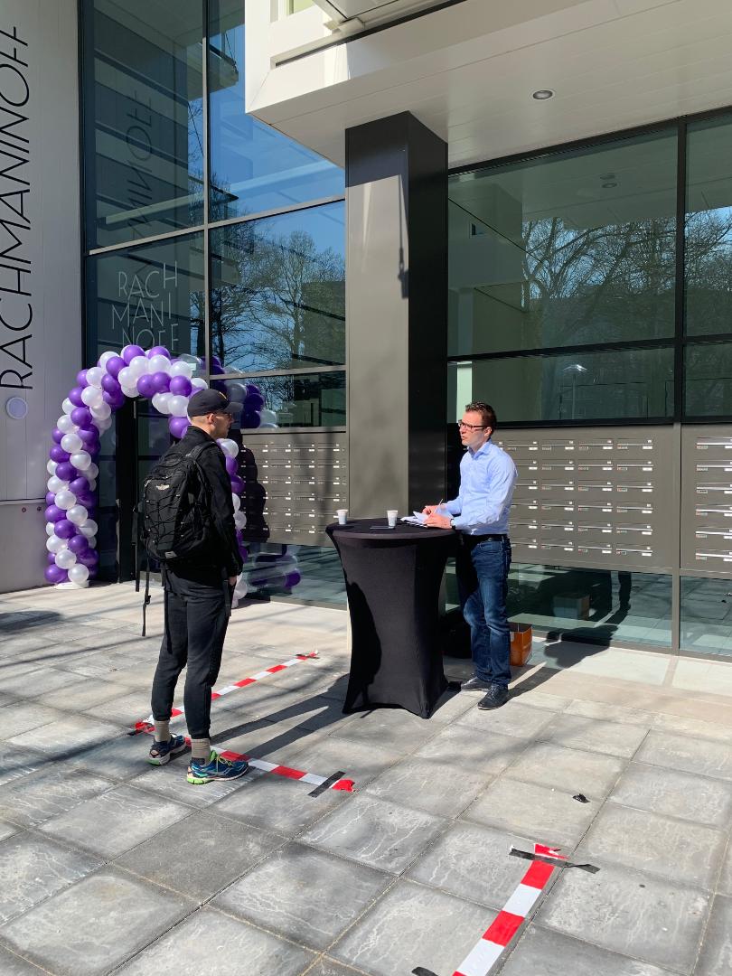 De protocollen zijn de deur uit. De nieuwe bewoners van de huurappartementen in Utrecht en IJmuiden zijn volledig op de hoogte van de maatregelen die genomen zijn voor het moment van de sleuteloverdracht van hun nieuwbouwwoning. De regels zijn strikt vanwege de coronacrisis. Anderhalve meter afstand en alleen de hoofdhuurder mag de sleutel op komen halen. “Jammer genoeg moeten we het persoonlijke contact beperken”, zegt Bouwinvest, eigenaar van appartementencomplex Rachmaninoff in Utrecht. “We hanteren een strak en duidelijk protocol”, meldt a.s.r. real estate, eigenaar van Parkzicht in IJmuiden.